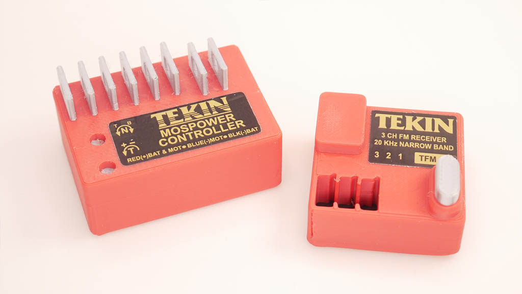 Pour exposer vos voitures RC vintage avec un total look Tekin d’époque, sans investir dans une électronique parfois couteuse et/ou difficile à trouver, voici l’ensemble récepteur variateur. Réalisé en impression 3D multicolore et accompagnés de leurs autocollants. Autre couleur de boitiers possible.