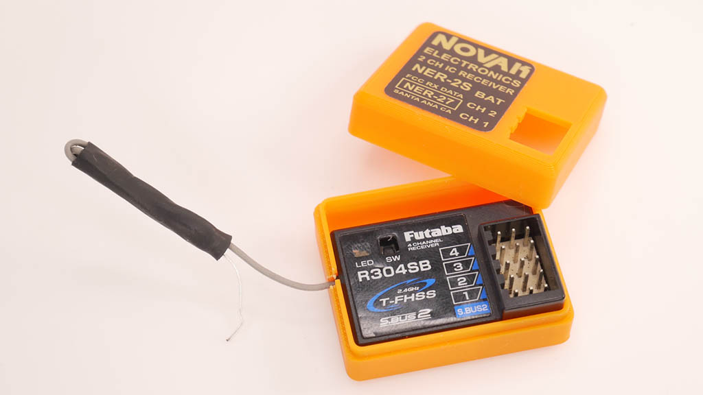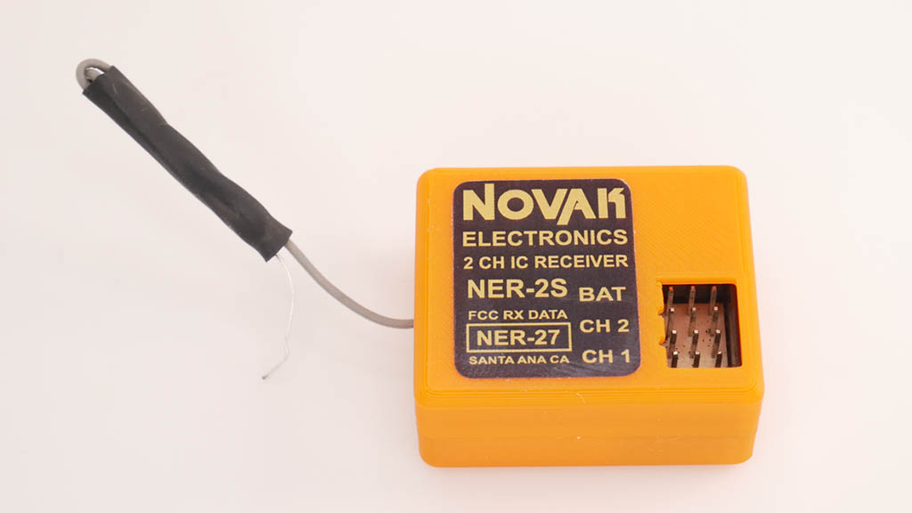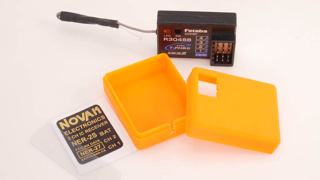 Pour rouler avec le style vintage de l’époque avec du matériel moderne, voici un sur-boîtier sur la base d’un récepteur Novak NER-2S permettant d’y dissimuler un récepteur moderne 2,4Ghz. Ce boîtier est adapté aux récepteurs Futaba R304SB et à ses variantes (dimensions 35.5 x 23.2 x 12.4mm). Ce sur-boîtier pèse seulement 6 grammes et dispose d’un volume intérieur de 35.5 x 30.5 x 15mm pour éventuellement utiliser d’autres récepteurs.